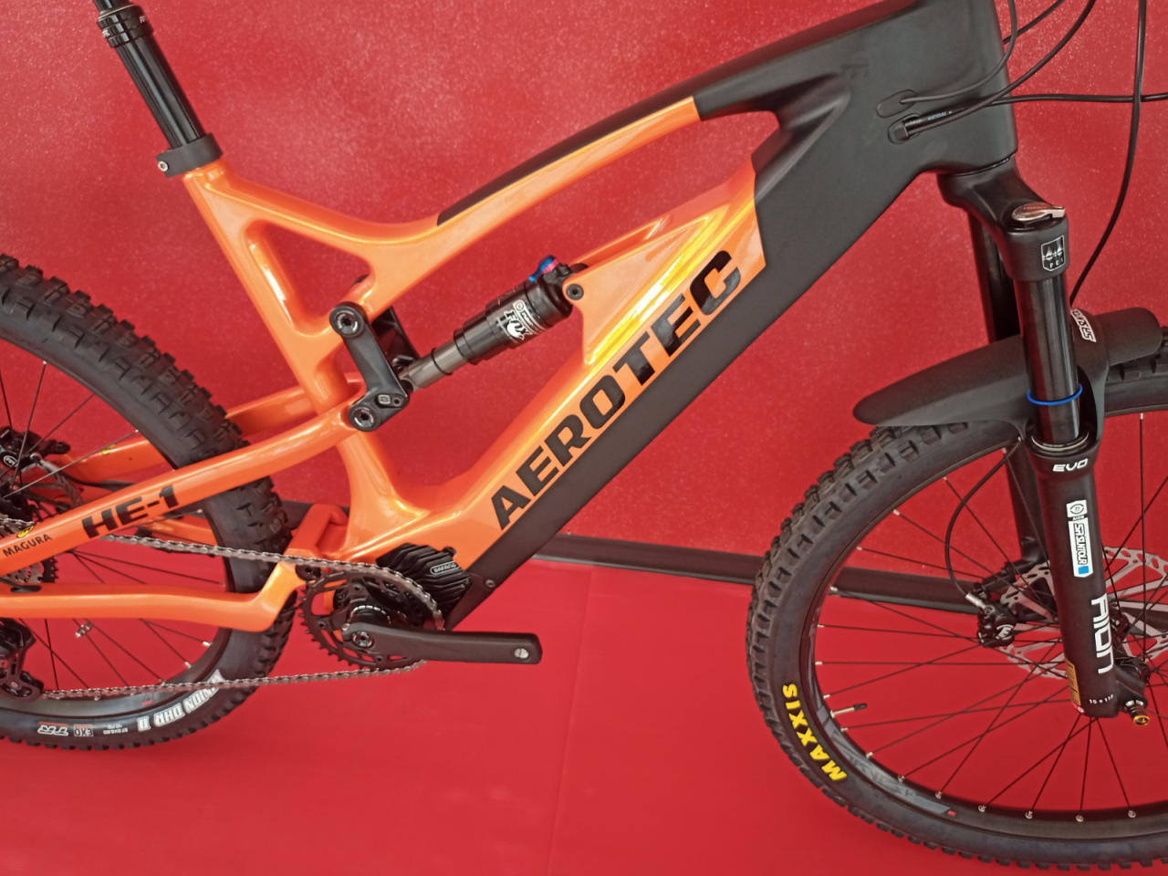 L’Aerotec HE-1 Carbon Hybrid è una e-bike full suspension progettata per affrontare ogni tipo di trail con potenza, controllo e comfort. Il telaio in carbonio da 160 mm di escursione, abbinato alla forcella Suntour Aion 35 da 29″ e all’ammortizzatore posteriore Raidon Air con lockout, assicura prestazioni elevate anche sui percorsi piĂą tecnici.