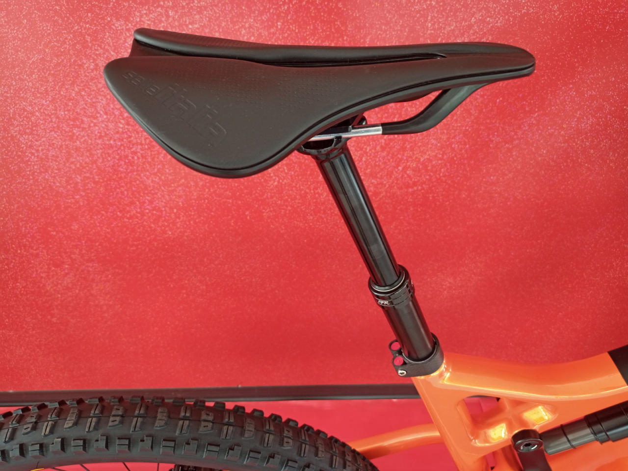 Il setup delle ruote è ottimizzato per la massima trazione: anteriore da 29″ e posteriore da 27.5″, entrambe con cerchi Rodi Tryp 35 e pneumatici Maxxis Minion DHF-DHR. Il reggisella telescopico con comando al manubrio completa un allestimento pensato per chi vuole il massimo in salita e in discesa.