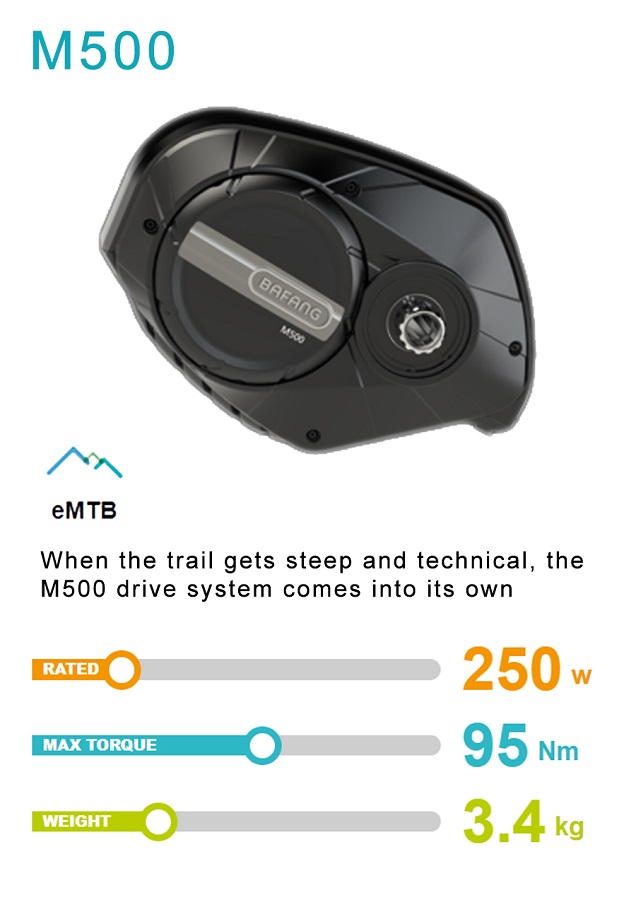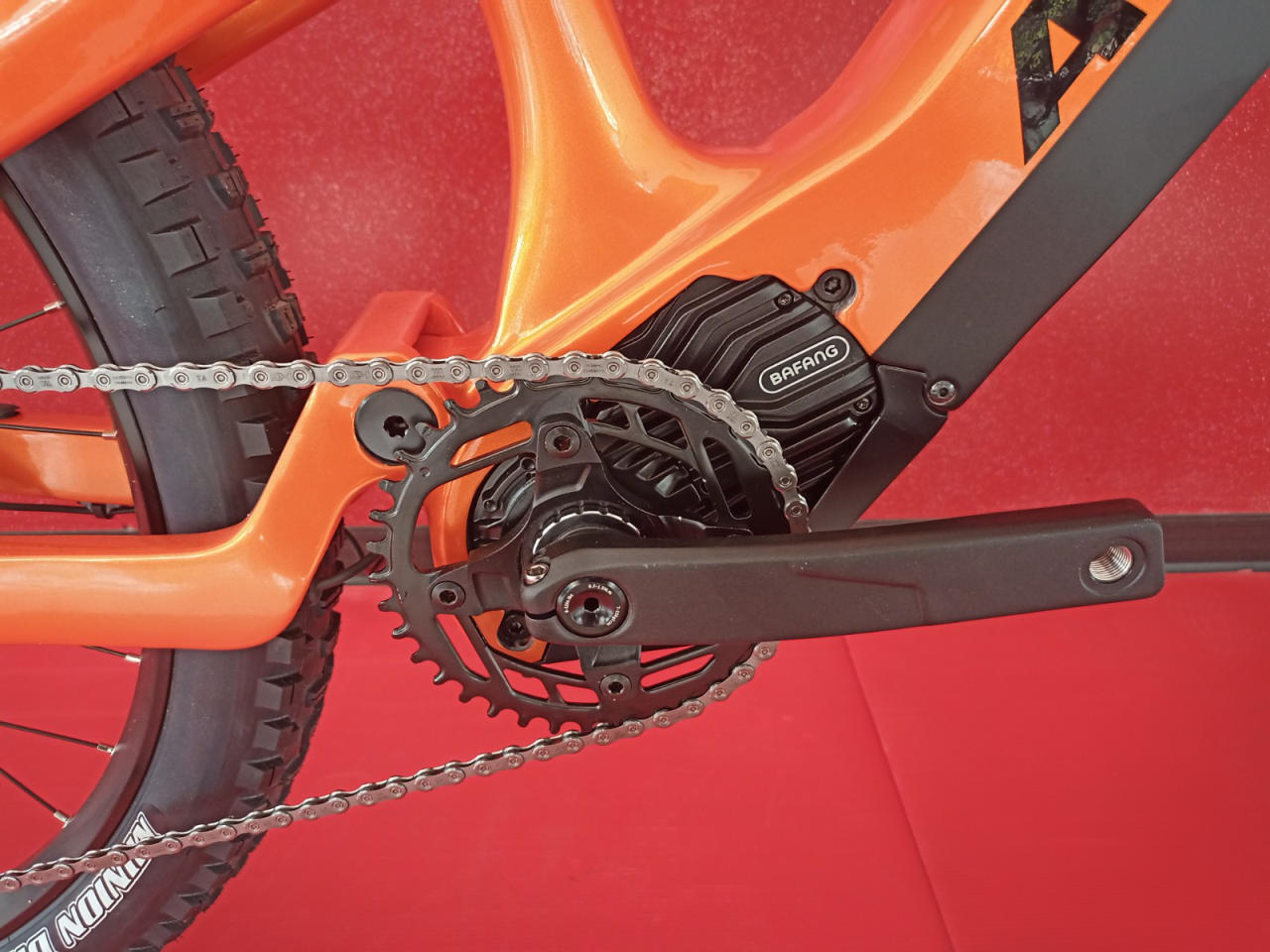 Il cuore della bici è il motore centrale Bafang M500 da 250W con una coppia di 95 Nm, alimentato da una batteria integrata Samsung da 670 Wh, perfetta per lunghe uscite off-road. La trasmissione Shimano Deore a 12 velocità offre cambi precisi e reattivi, mentre i freni Magura MT Trail Sport garantiscono una frenata potente e modulabile.